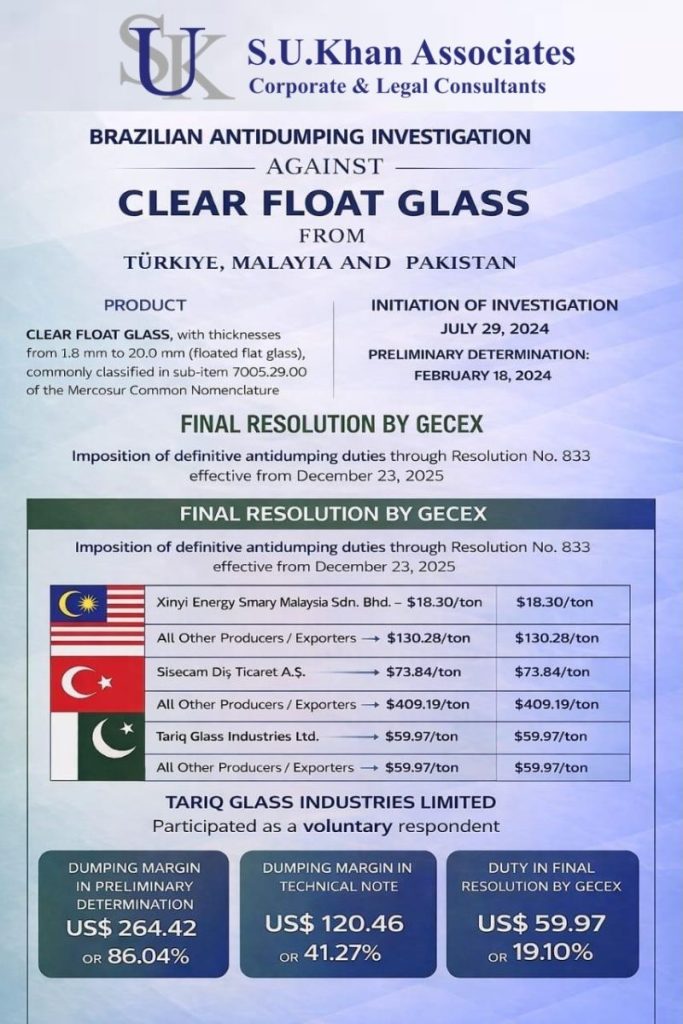 In this investigation, S.U. Khan Associates, Corporate & Legal Consultants acted as Pakistani Counsel for Tariq Glass Industries Limited (TGIL), which participated as a voluntary respondent, working in close coordination with our associated Brazilian Counsel, Monteiro & Weiss Trade. We jointly with our Brazilian Counsel provided comprehensive legal and technical advisory support throughout the investigation and had the opportunity to host the Brazilian investigating officials during the on-the-spot verification, ensuring a transparent and professional engagement with Brazilian Department of Trade Remedies (DECOM).